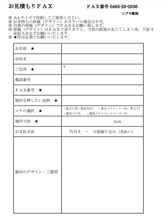・下部に「見積り用紙」もございますが、手書きでのFAX見積りも承ります。